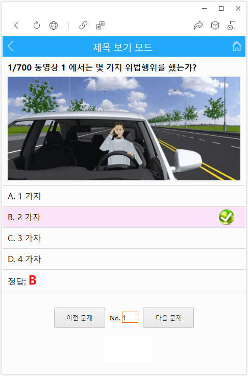 5. 모의고사:시험규칙에 따라 무작위로 100문제를 추출하여 시험하는데 시험시간은 45분이고 문제당 1점, 90점 및 그 이상이 합격이다.